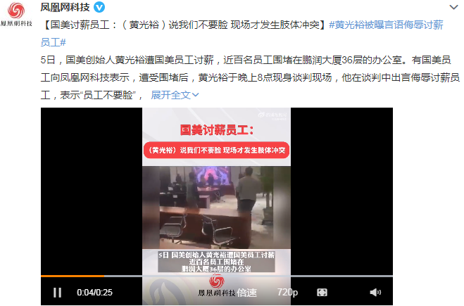 据@凤凰网科技报道,昨日,国美创始人黄光裕遭国美员工讨薪,近百名员工围堵在鹏润大厦36层的办公室。有国美员工向凤凰网科技表示,遭受围堵后,黄光裕于晚上8点现身谈判现场,他在谈判中出言侮辱讨薪员工,表示“员工不要脸”,导致多名员工与黄光裕保安发生肢体冲突,随后警察进行了调解。