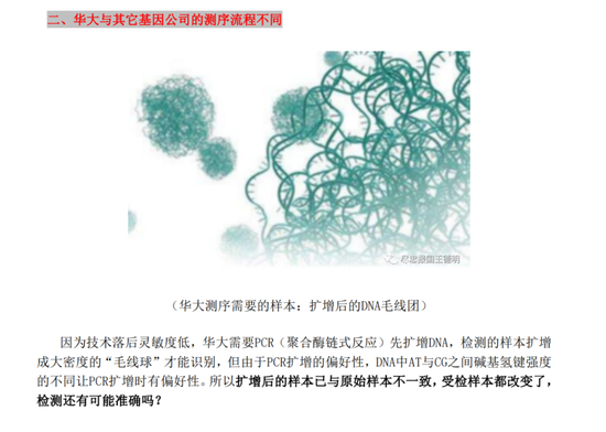 比如王德明称,华大因为技术落后灵敏度低,需要PCR(聚合酶链式反应)先扩增DNA,但由于DNA中AT与CG之间碱基氢键强度的不同让PCR扩增时有偏好性,扩增后的样本已与原始样本不一致。而其他基因检测公司使用的平台不需要扩增,直接测原始纯净的DNA链,不易出错。
