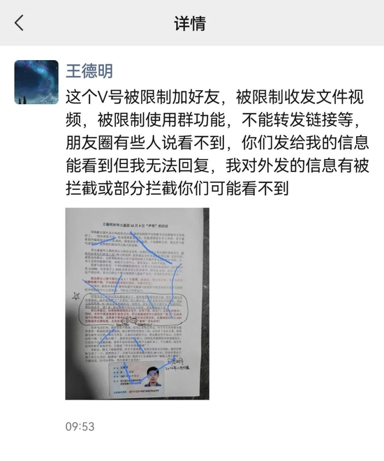 但现在的王德明,外人很难与之取得联系。据其在朋友圈称,“不敢接电话,因为之前被定位过;微信号也已被限制加好友、收发文件、视频、使用群功能,即使能看到其他人发来的信息也无法回复,对外发的信息还可能被拦截……”