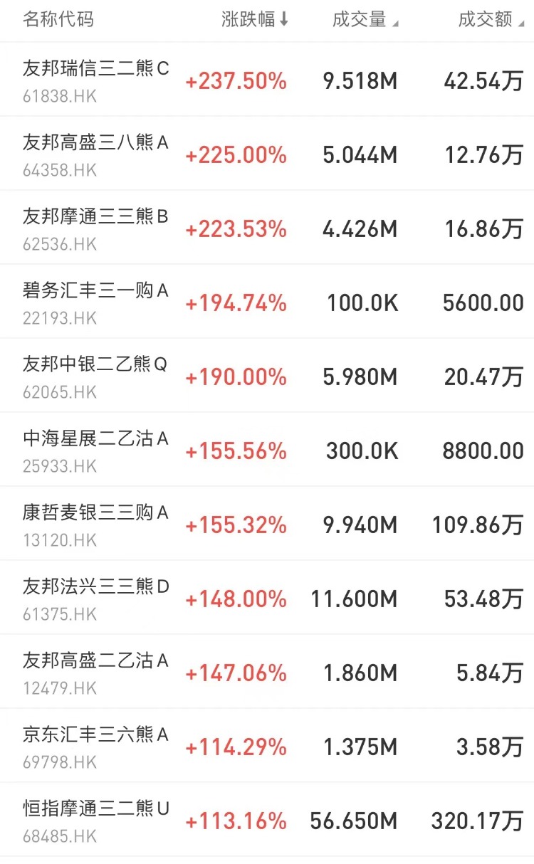 在今日涨幅榜中,友邦瑞信三二熊C涨237.50%,康哲麦银三三购A涨155.32%,京东汇丰三六熊A涨114.29%。