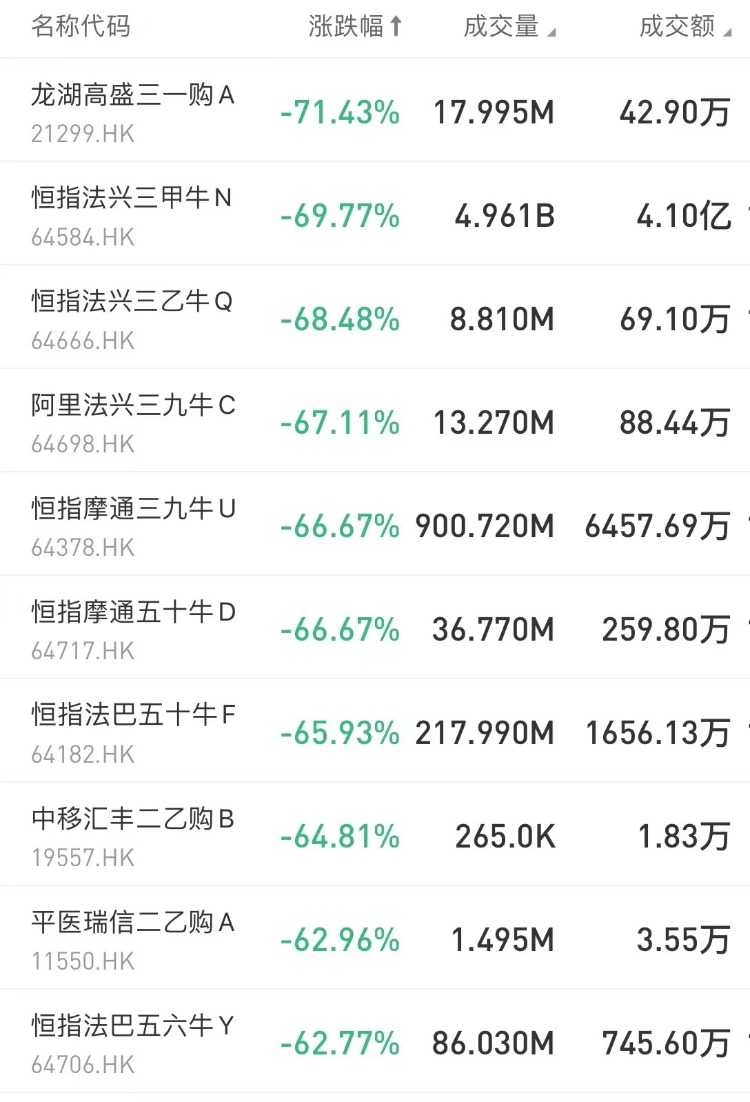 在今日跌幅榜中,龙湖高盛三一购A跌71.43%,恒指法兴三甲牛N跌69.77%。