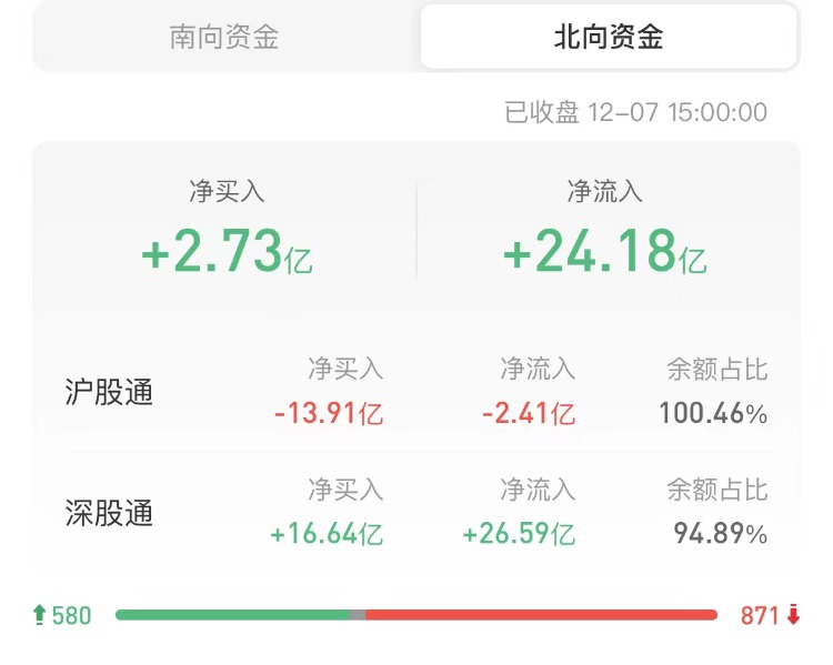 北上资金今日净买入2.73亿元,沪股通净卖出13.91亿元,深股通净买入16.64亿元。上一交易日净买入5.41亿元。