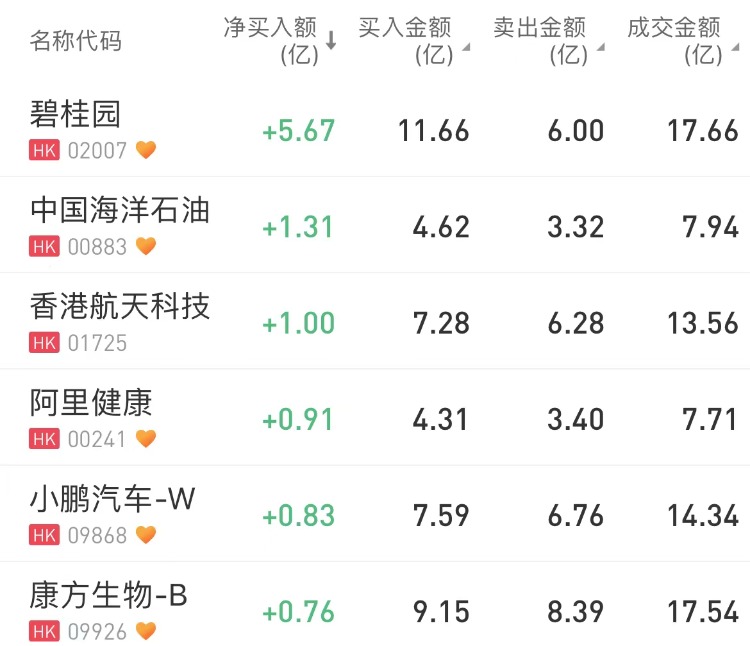 南下资金净买入碧桂园 $02007.HK 5.67亿港元,净买入中国海洋石油 $00883.HK 1.31亿港元。此外,香港航天科技 $01725.HK 、阿里健康 $00241.HK 分别获净买入1.00港元、0.91亿港元。