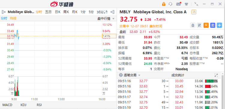 Mobileye逆市涨7.41%,报32.75美元,第三季度营收同比增长38%至4.5亿美元。