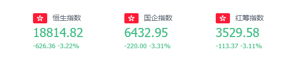 恒生指数收盘跌3.22%报18814.82点,恒生科技指数跌3.77%,恒生国企指数跌3.31%。大市成交2074.16亿港元,南向资金净卖出50.25亿港元。地产、科技、有色股跌幅居前,航空、文旅、博彩股冲高回落。