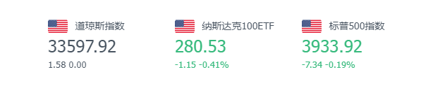 道指微涨1.58点接近平收报33597.92点,标普500指数跌0.19%报3933.92点,纳指跌0.51%报10958.55点。