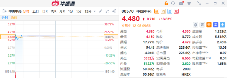 12月8日讯,中国中药(00570)早盘跳空高开14.85%,为7月中旬以来高位,现涨幅扩大至18%。有消息称,国药考虑以每股6港元的价格将中国中药私有化,较昨日收市价3.77港元溢价59.15%。