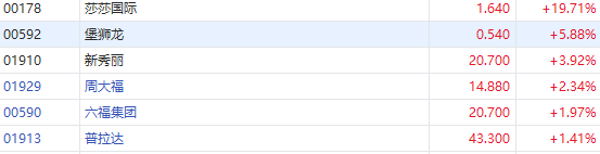 部分香港本地消费股冲高,莎莎国际(00178)涨近20%,谭仔国际(02217)涨超13%,新秀丽(01910)涨超3%,周大福、六福集团、普拉达等跟涨。