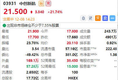 华盛资讯12月8日消息,中创新航(03931)午后涨超21%,截至发稿,报21.5港元,成交额4901万港元。