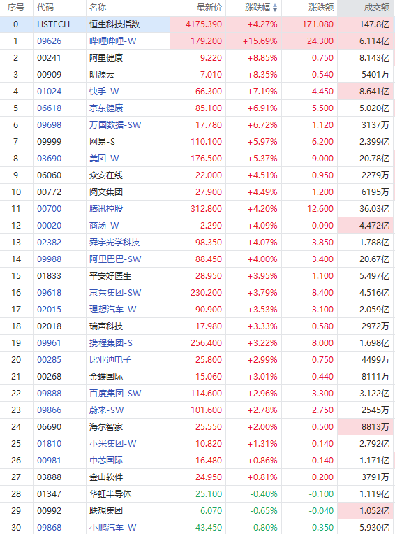 科网股集体走高,哔哩哔哩-W涨超15%,快手-W涨超7%,网易-S、美团-W涨超5%,腾讯控股、阿里巴巴、商汤-W涨超4%。