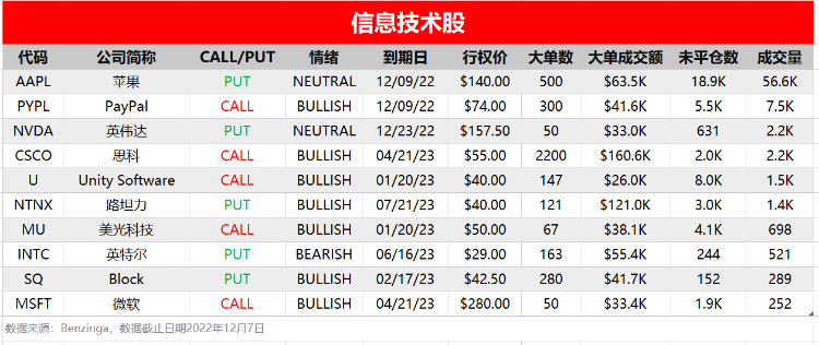 周三(12月7日),非必选消费、信息技术和金融板块相关个股出现较多活跃单,按照当日成交量排行,榜单TOP分别如下: