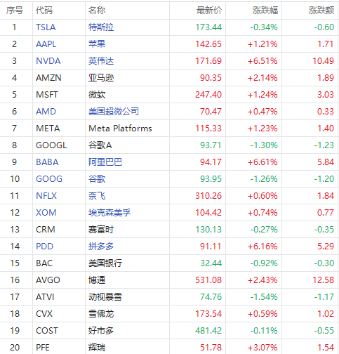 以下为美股当日交易最活跃的20只股票(按成交额):