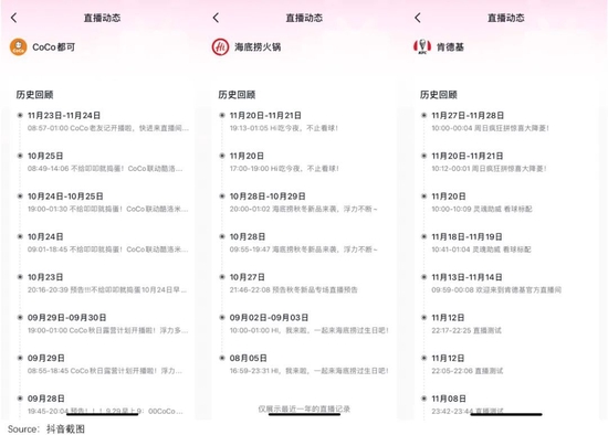 可以看到,即使消化能力较强的品牌,自播也相对克制——肯德基、coco和海底捞等,除了10月底开始双十一活动之外,其余时间的直播频次都不高。