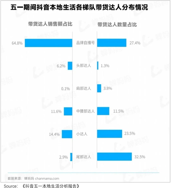 从五一期间抖音本地生活带货情况可以看出,品牌自播号以27.4%的数量占比撬动了64.8%的市场份额,转化率确实相对较高。