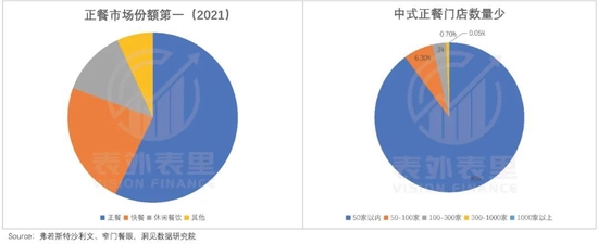 而有些品牌商家则困于门店数量不足,以2021年占餐饮市场份额过半的正餐为例,单一品牌门店超50家的品牌仅占10%,尾部参与者居多。