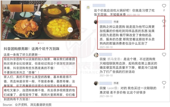 而有些商家为了挤出利润空间,压缩食材成本,从而导致用户体验差。比如,不少用户在社交平台反馈,抖音到店商家买家秀和卖家秀差别很大。