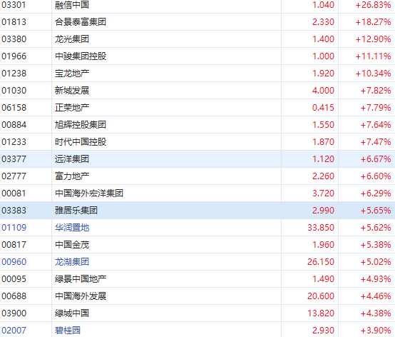 12月9日消息,港股内房股持续走高,融信中国涨超26%,合景泰富集团涨超18%,龙光集团涨超12%,宝龙地产涨超10%,旭辉控股集团、正荣地产、新城发展涨超7%,华润置地、龙湖集团等涨超5%。