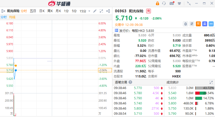 华盛资讯12月9日讯,头部民营保险集团阳光保险 $06963.HK 首挂平开,股价现跌2.06%,成交额超3900万港元,昨日暗盘收跌0.17%。