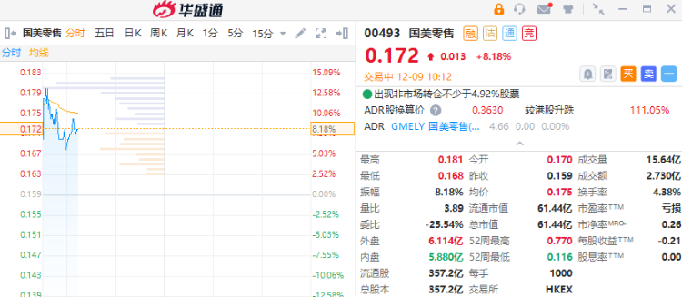 12月9日,国美零售(00493.HK)早盘一度涨超13%,截至发稿,该股现涨超8%,报0.172港元,成交额2.73亿港元。