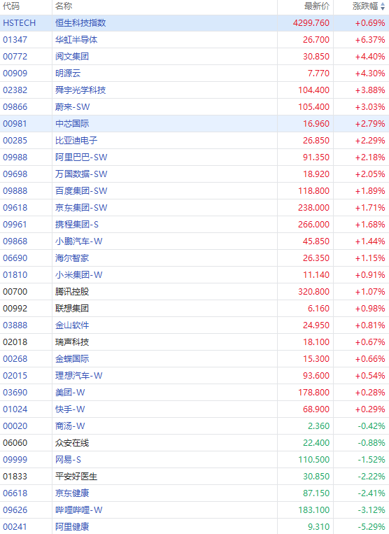 半导体概念领涨,华虹半导体涨超6%,中芯国际涨超2%;科网股涨跌互现,阿里巴巴-SW涨超2%,京东集团-SW涨超1%;网易-S跌近2%,哔哩哔哩-W跌超3%。