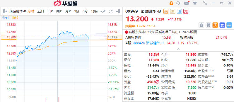 机构指,奥布替尼适应症范围与市场空间将持续扩展,近一年,公司多项里程碑事件有望陆续落地。截至发稿,诺诚健华12.12%,报13.32港元,成交额0.95亿港元。