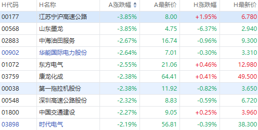 山东墨龙A股跌超4%,H股跌超6%;中海油田服务A股跌超2%,H股跌0.96%;华能国际电力股份A股跌超2%,H股跌0.3%。