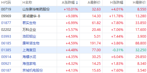 截至发稿,山东新华制药股份A股涨停,H股涨超4%;诺诚健华A股涨9.08%,H股涨超11%;君实生物A股涨6.99%,H股涨超7%;万科企业A股涨超5%,H股涨超7%。