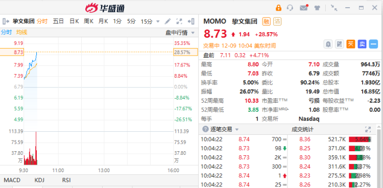 华盛资讯12月9日消息,热门中概股走势分化,截至发稿,挚文集团大涨近29%,报8.73美元。该股周四绩后收涨逾29%。财报显示,2022年第三季度,挚文集团净营收达32.33亿元(约4.545亿美元),不按照美国通用会计准则计量,归属于挚文集团的净利润为5.358亿元(约7530万美元),持续31个季度盈利。