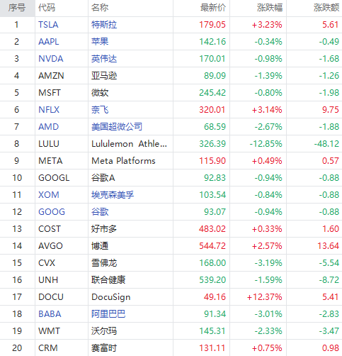 第11名埃克森美孚收跌0.84%,成交21.7亿美元。第15名雪佛龙收跌3.19%,成交18.2亿美元。在石油需求和价格高企的情况下,这两家石油美国最大的公司都披露了明年增加能源项目支出的计划。
