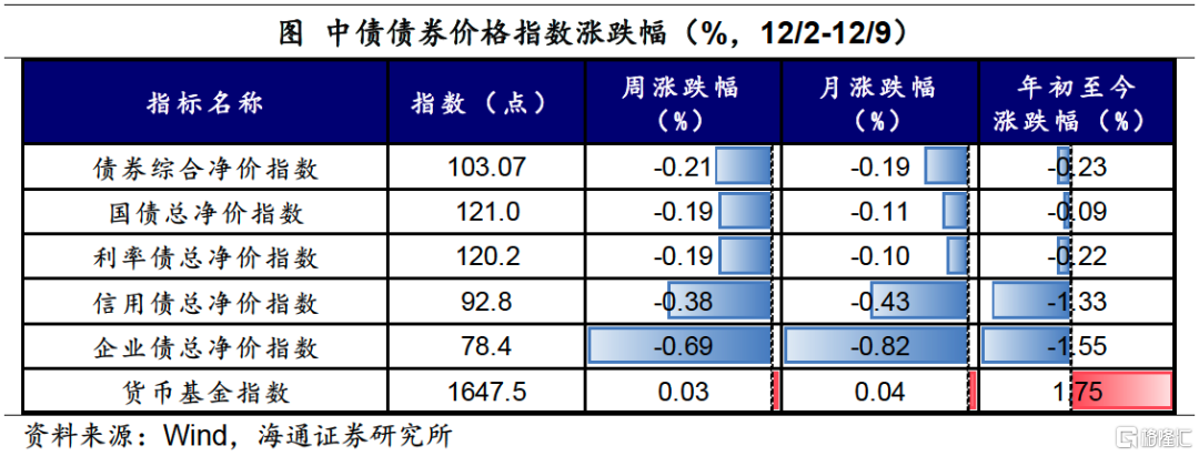 从价格表现看,利率债、信用债净价指数普遍下行,跌幅分别为0.19%和0.38%,而货币基金指数小幅上涨0.03%。中债国债净价指数下跌0.19%,本月以来整体跌幅达0.11%;企业债净价指数下跌0.69%,本月以来跌幅为0.82%。