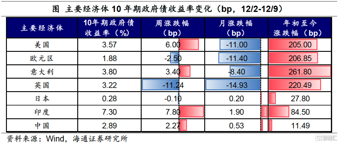 上周,欧美主要经济体长期政府债利率涨跌不一。10年期美债收益率上行6bp,10年期欧元区公债利率则下行2.5bp,本月以来累计降幅达到11.4bp。10年期英国国债利率下行11.2bp,本月以来累计降幅近15bp。其他海外经济体方面,10年期印度10年期国债利率上行7.8bp,10年期日本国债利率较为稳定,小幅下行0.1bp。