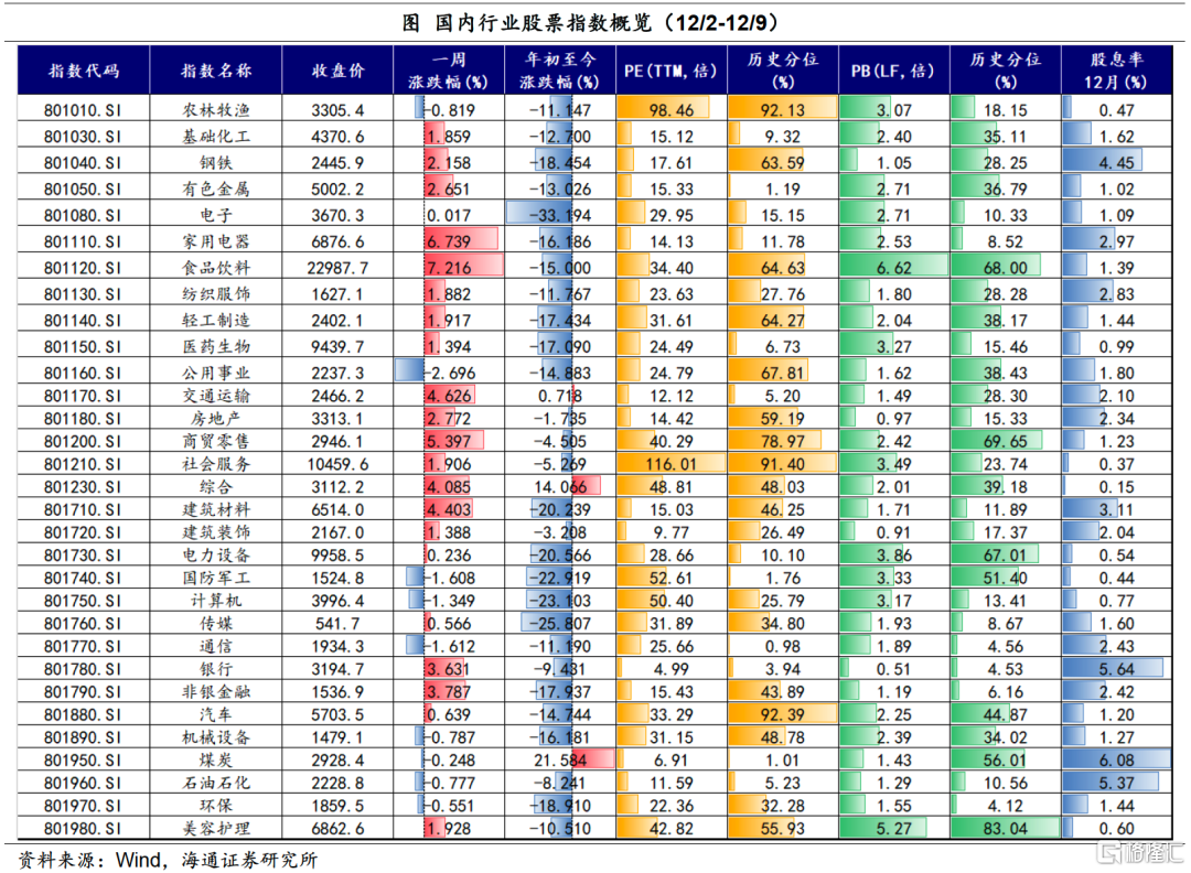 行业估值位置分化明显。农林牧渔、社会服务、汽车行业PE(TTM)估值在历史90%分位数以上,食品饮料估值回升至历史60%分位数以上,通信行业估值回落至历史1%分位数以下。