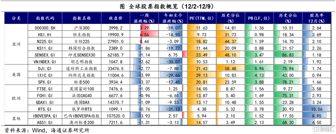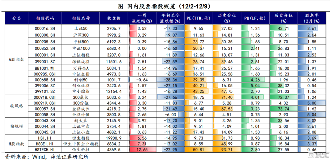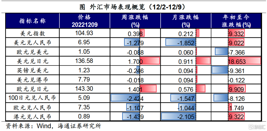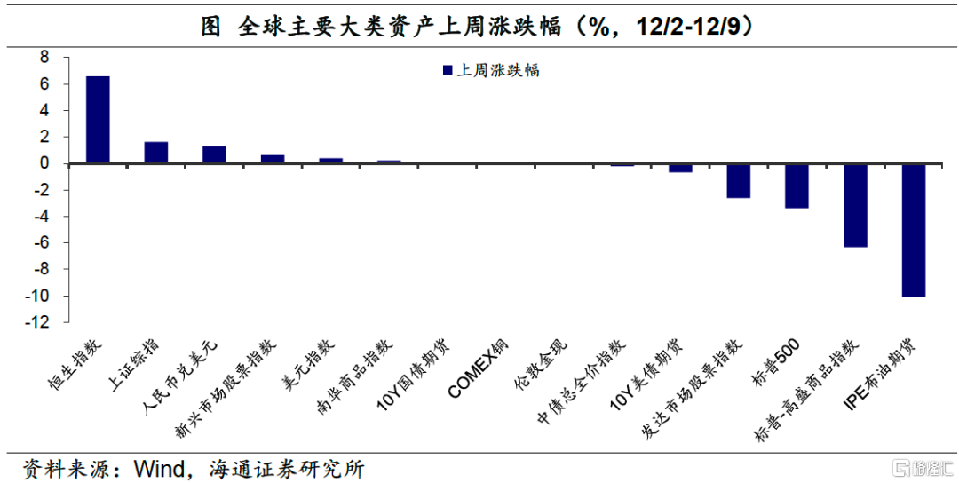 上周港股表现依然亮眼,国内核心资产修复,人民币大幅升值,这主要还是来自于疫情、房地产政策的大幅改善和优化,继续延续前一周的逻辑。海外美股下跌,美元指数、美债利率小幅上行,美国通胀居高不下仍是关键,下周二(12月13日)晚上美国11月CPI数据即将公布,需要重点关注,如果核心CPI高于市场预期,市场对美国通胀降温、美联储加息放缓的逻辑可能会阶段性反转。下周四(12月15日)凌晨美联储11月议息会议也将公布新的决议,也是需要重点关注的,外部美元流动性压力缓解的趋势可能会出现变化。下周四(12月15日)中国统计局也将公布11月经济数据,预计生产、消费、投资等数据或均较10月回落,短期疫情仍然对经济基本面构成影响。但最关键的是关注中央经济工作会议的政策指引和具体产业方向的态度,预计大中华区资产价格修复的趋势有望延续。