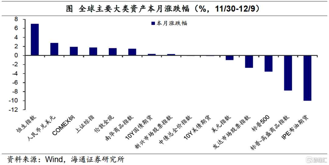 对比12月以来全球大类资产价格,恒生指数领涨(7.0%),涨幅较前的还有人民币兑美元(2.8%)、COMEX铜(1.9%)、上证综指(1.8%),发达国家股指(-2.6%)表现弱于新兴市场(0.6%);10年期美债期货(-0.1%)下跌而10年期中债期货上涨(0.3%),美元指数下跌(-1.0%)。跌幅领先的是IPE布油(-10.0%),其次是高盛商品指数(-7.7%)。