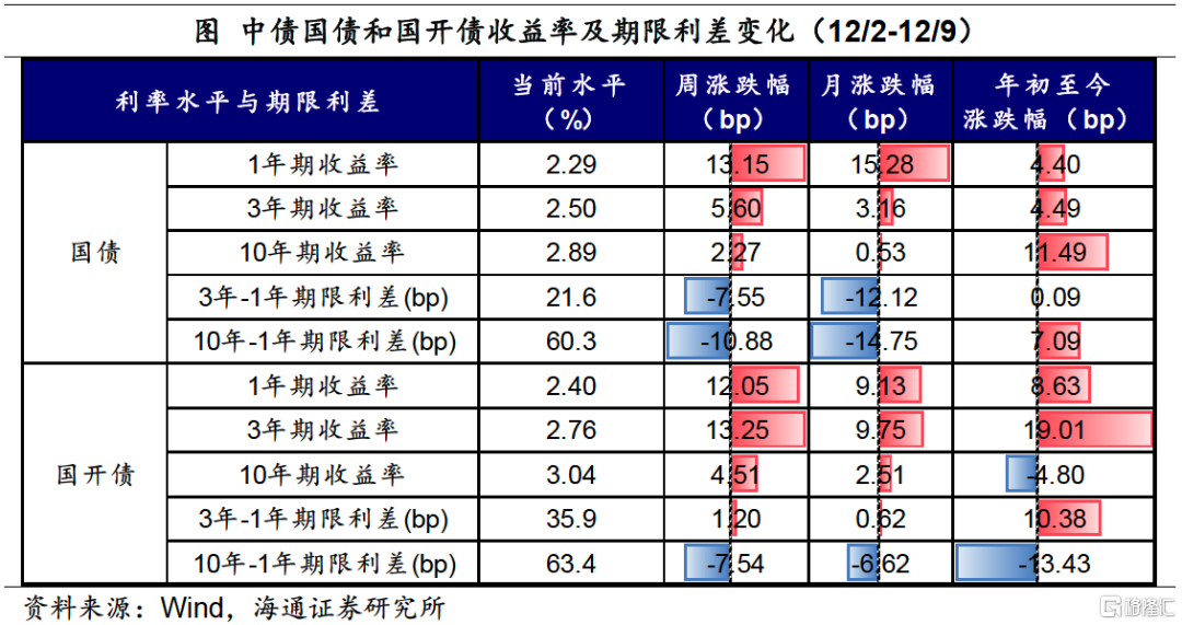 上周(12/2-12/9)受疫情政策优化影响,各期限的国债和国开债收益率延续上涨。10年期国债收益率上行2.3bp至2.89%,10年期国开债收益率上行4.5bp至3.04%,短端的1年期国债利率上行13.2bp,1年期国开债利率上行12.1bp。国债期限利差缩窄,10Y-1Y国债利差缩窄10.9bp至60bp,3Y-1Y国债利差缩窄7.6bp至22bp;10Y-1Y国开债利差缩窄7.5bp,3Y-1Y国开债利差则小幅走阔。
