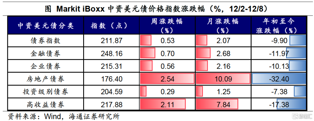 中资美元债方面,上周主要指数保持上涨趋势,其中房地产美元债指数继续领涨,涨幅为2.5%,本月以来的涨幅已超过10%,但相较年初依然下跌了有32.4%;上周金融债、企业债指数涨幅分别为0.7%和0.6%。