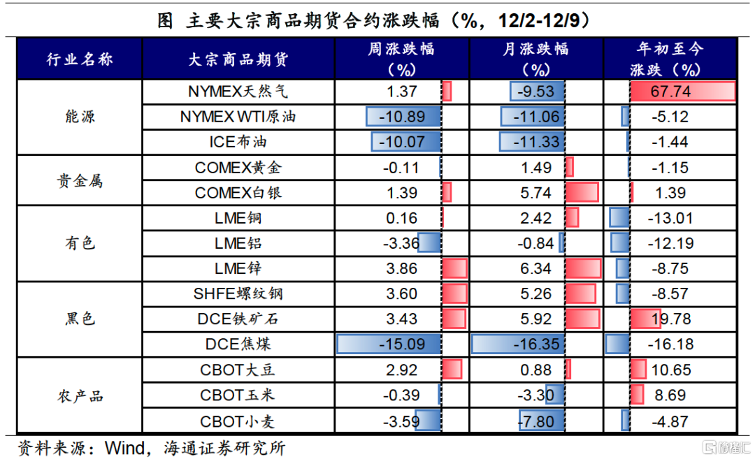 上周(12/2-12/9),海外原油价格再度明显下跌,WTI原油下跌10.9%,有色、黑色、农产品各品种价格均涨跌互现。对比来看,LME锌涨幅领先(3.9%)、SHFE螺纹钢(3.6%)、DCE铁矿石(3.4%)、CBOT大豆(2.9%)、COMEX白银(1.4%)紧随其后。从下跌幅度来看,DCE焦煤跌幅领先,达到15.1%,其后是ICE布油(-10.1%)、CBOT小麦(-3.6%)、LME铝(-3.4%);COMEX黄金价格则基本持平。