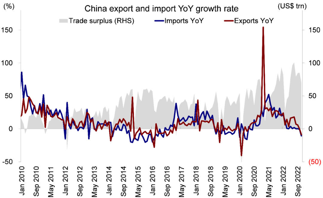 4) 由于外需下滑,11月贸易数据大幅下降。11月中国出口同比下降8.7%,与10月0.3%的降幅相比下降步伐明显加快,且明显低于市场预期。同时,11月中国进口同比也出现下降,降幅从10月的0.7%扩大至10.6%。我们认为几个因素共同导致11月出口增速放缓,其中外需快速下行可能是首要因素。另外,高基数效应和疫情反复是导致出口降幅超出预期的其它几个显著因素。