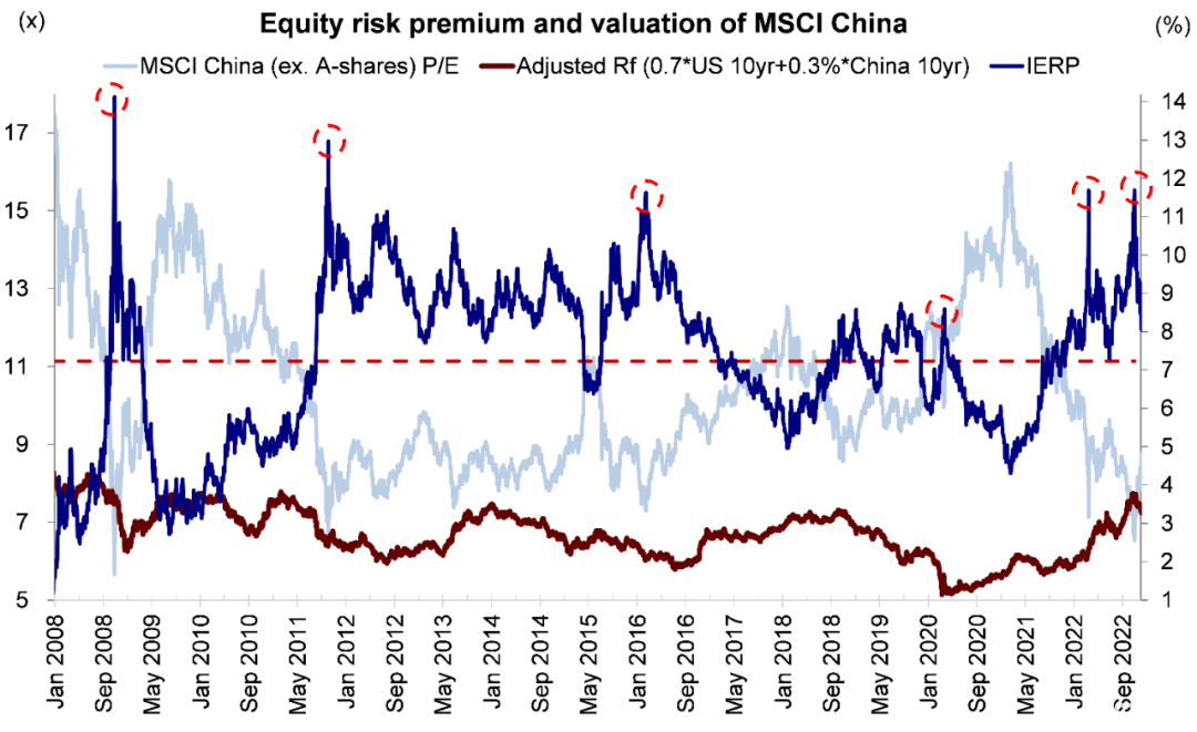 ► 估值与风险溢价:MSCI中国(除A股)12个月动态市盈率已从历史最低点6.5倍回升至8.8倍,但仍然位于过去十年均值以下约0.7倍标准差。以反弹幅度较大的房地产板块为例,在涨幅超过60%后其市净率从此前的0.4倍升至约0.7倍。进一步通过将指数表现拆分为估值和盈利因素后,我们发现在MSCI中国指数37%的涨幅中市盈率贡献了超过34个百分点。与此同时,股权风险溢价也从此前高点11.7%回落至8.0%,处于2013年以来平均水平上方0.2倍标准差。