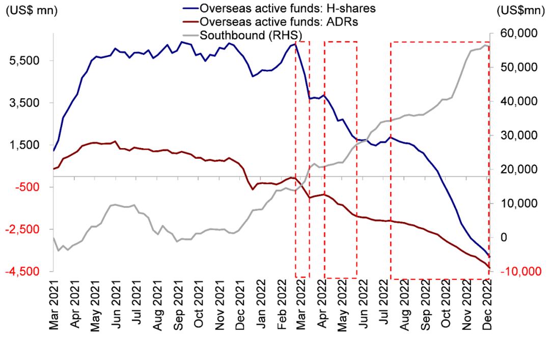 图表:南向资金和海外主动型基金双双流出海外中资股市场