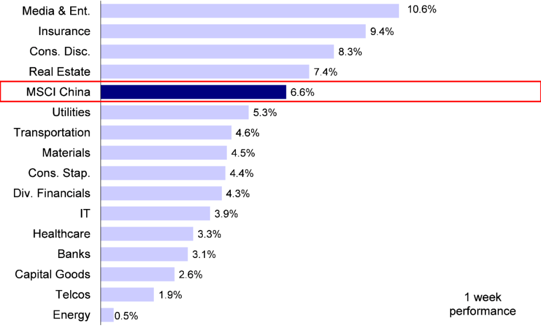 图表:MSCI中国指数上周上涨6.6%,传媒娱乐和保险板块领涨
