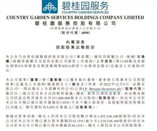 12月11日晚间,碧桂园服务(6098.HK)发布公告称,公司非执行董事、董事会主席兼公司控股股东杨惠妍女士全资拥有的必胜有限公司已与J.P.MorganSecuritiesplc(配售代理)签订以二级大宗交易方式的配售协议。