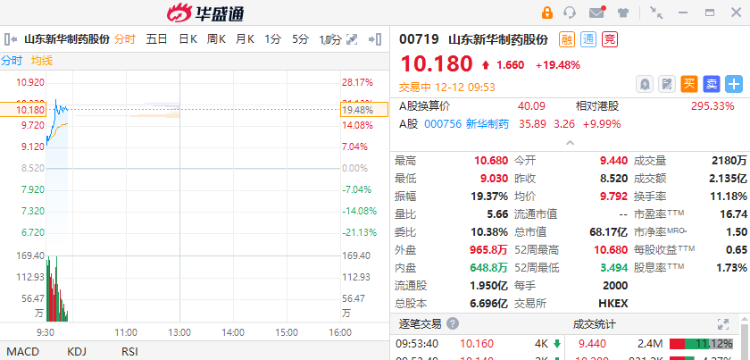 山东新华制药(00719)AH股齐涨,截至发稿,公司A股涨停,收获四连板;H股涨19.48%,报10.18港元,成交额2.135亿港元。