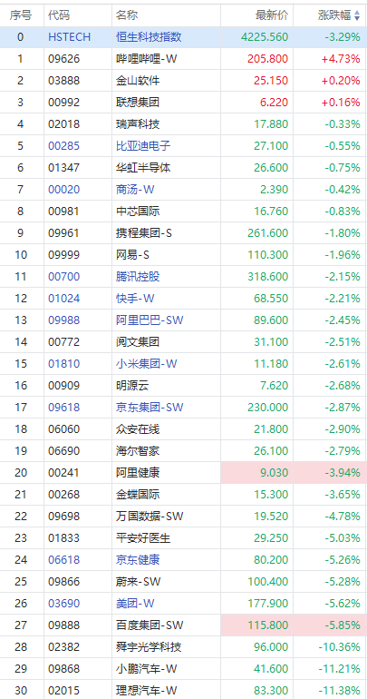 科网股方面,腾讯控股跌2.15%,快手-W跌2.21%,阿里巴巴-SW跌2.45%,小米集团-W跌2.61%,京东集团-SW跌2.87%;