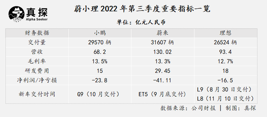 新车交付前往往伴随着不令人愉快的“过渡期”。因此,新造车在三季度的业绩备受关注。11月以来,蔚小理陆续发布了2022年三季度财报,核心数据见下表: