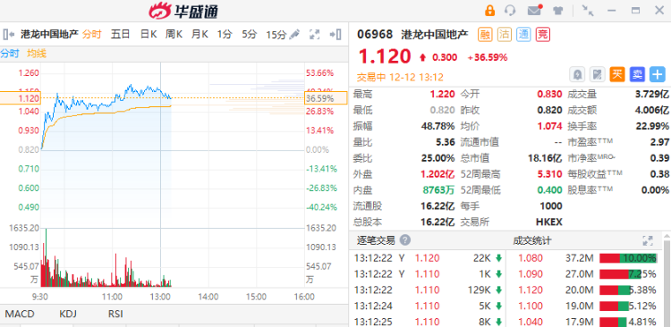 港龙中国地产逆市走高,截至发稿,现涨36.59%,报1.12港元,成交额4.006亿港元。11月初,港龙中国股价一度大跌近80%,随后企稳回弹。