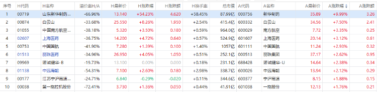 截至发稿,山东新华制药股份A股收获四连板,H股涨超54%;白云山A股涨7.5%,H股涨超8%;中国南方航空A股涨3.35%,H股涨超3%;上海医药A股涨超3%,H股涨超4%。