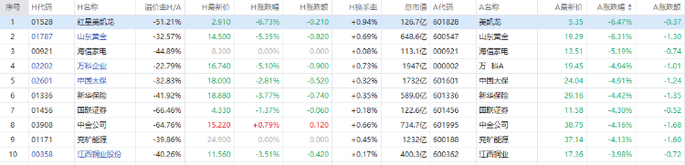 山东黄金A股跌超6%,H股跌超5%;万科企业A股跌近5%,H股跌超5%;中国太保A股跌超4%,H股跌近3%。