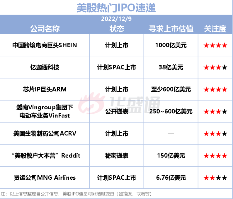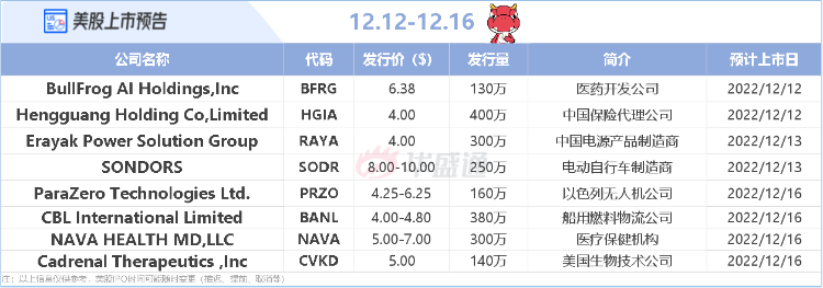 本周IPO市场,截至目前,暂时预计将迎来8只新股挂牌,中国公司恒光控股和雷亚电子预计周一和周二登陆美股市场。需要注意的是,美股IPO时间可能随时变更(包括提前、延后等),投资者需持续跟进相关消息。