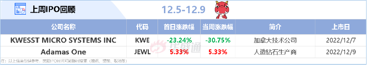 上周美股市场只有2只新股上市,加拿大技术公司KWE表现不佳,上周三登陆纳斯达克市场开始交易,首日跌幅达23.24%。人造钻石生产商JEWL上周五首日开盘上涨91%,随后触发熔断。